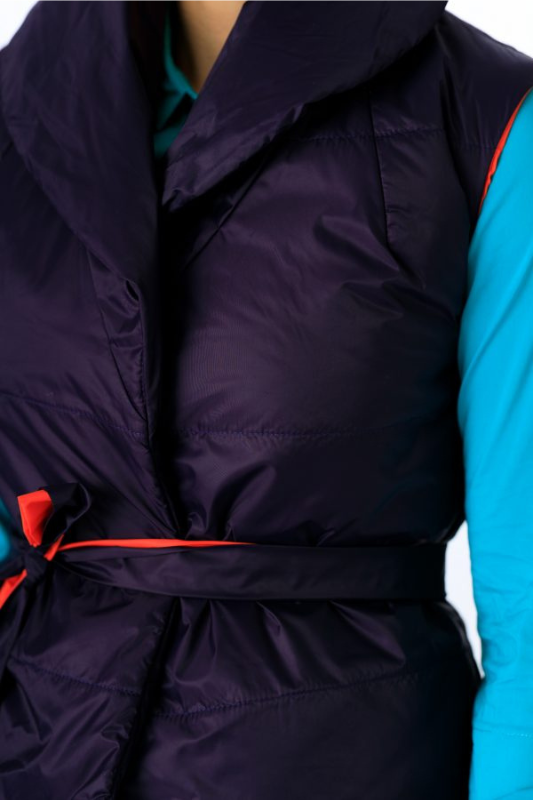 Vesta casual din fas mov, matlasata cu interior de fas portocaliu. Vesta se inchide prin legarea cordonului in jurul taliei. Modelul este potrivit pentru sezonul de primavara sau toamna. Vesta are guler inalt.
