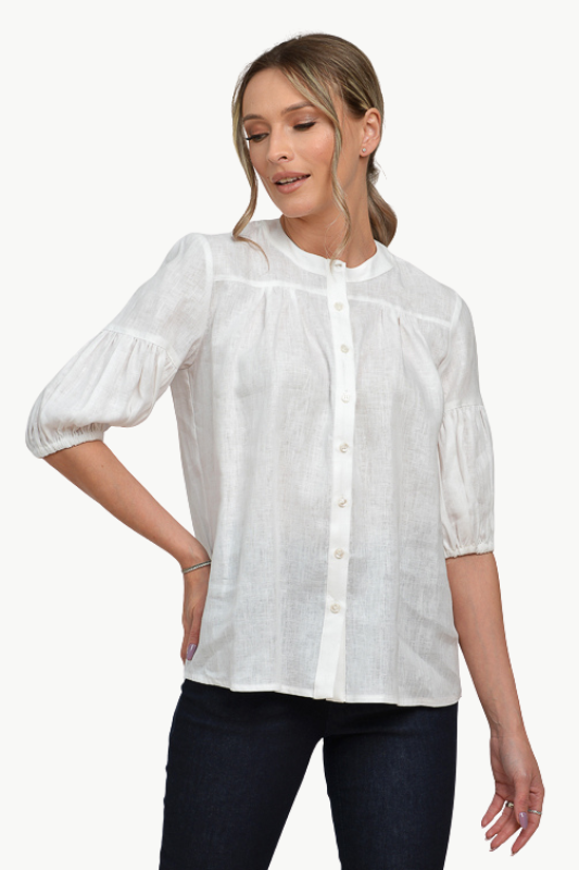 Camasa office din bumbac alb, croi in forma de A si maneca 2/3. Se inchide cu nasturi in partea din fata. Se asorteaza cu o pereche de pantaloni conici. Poate fi accesorizata cu un colier colorat.
