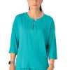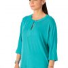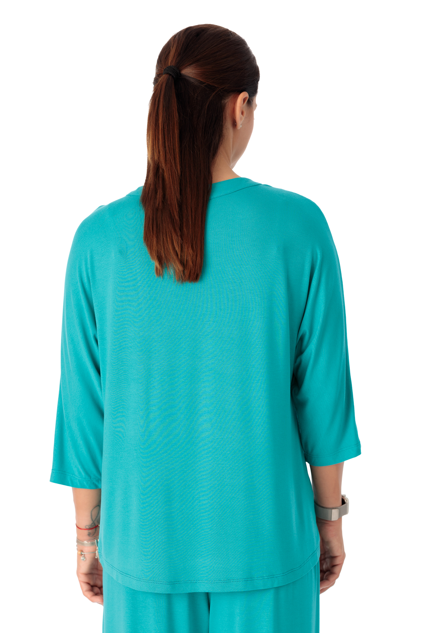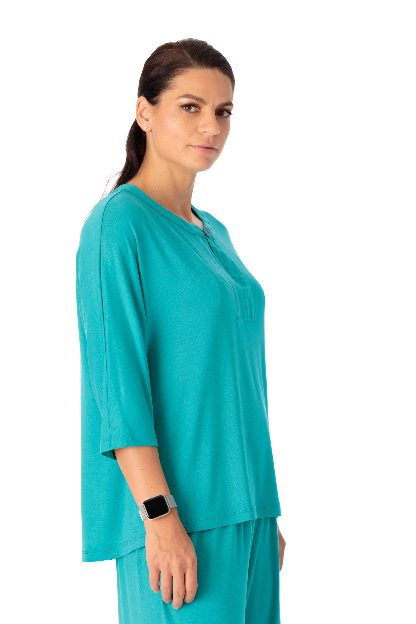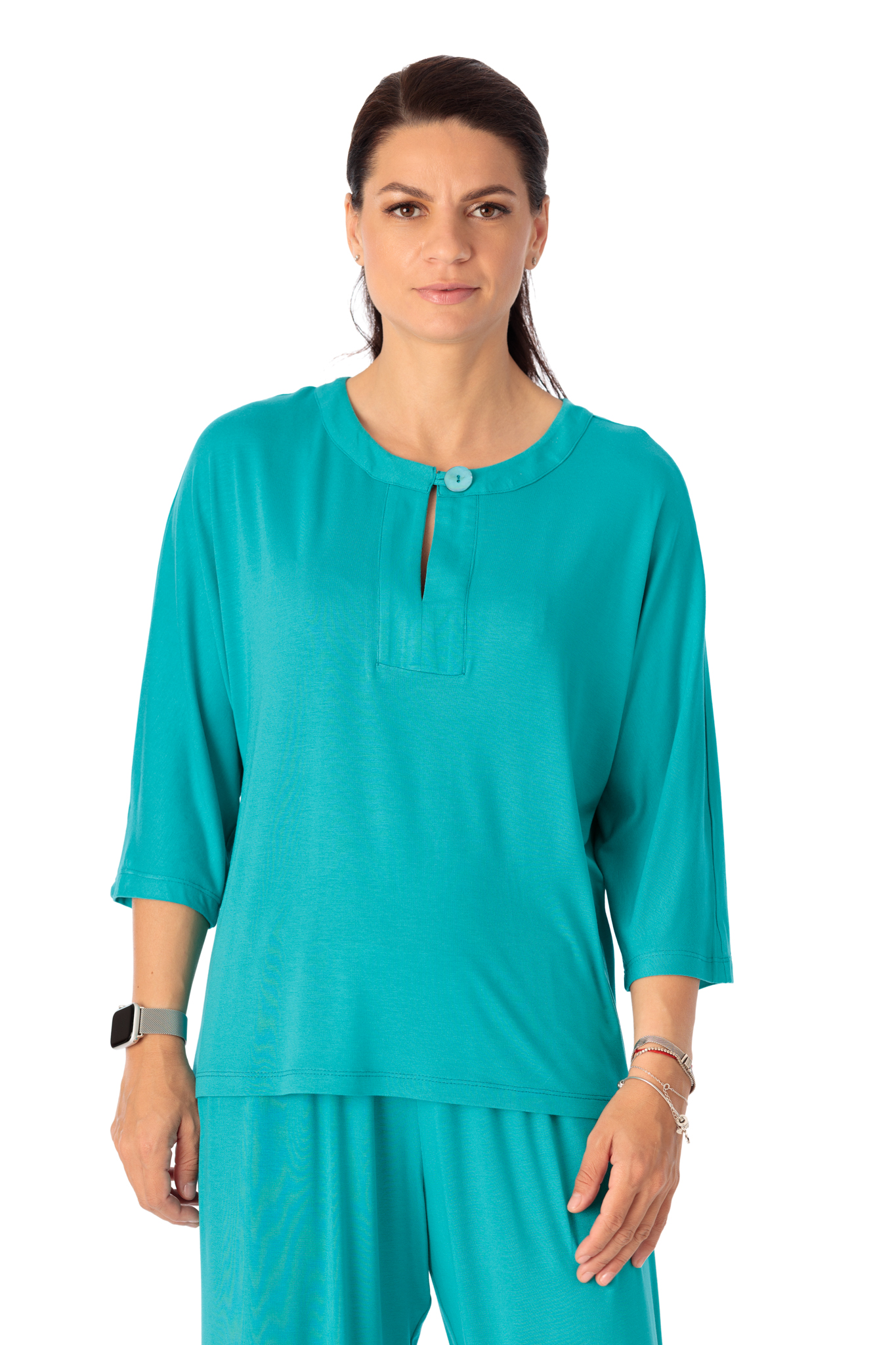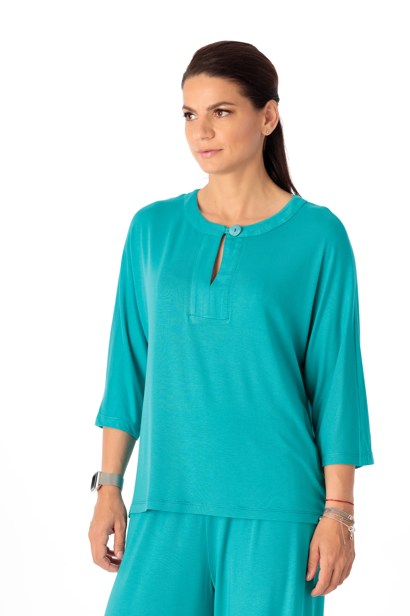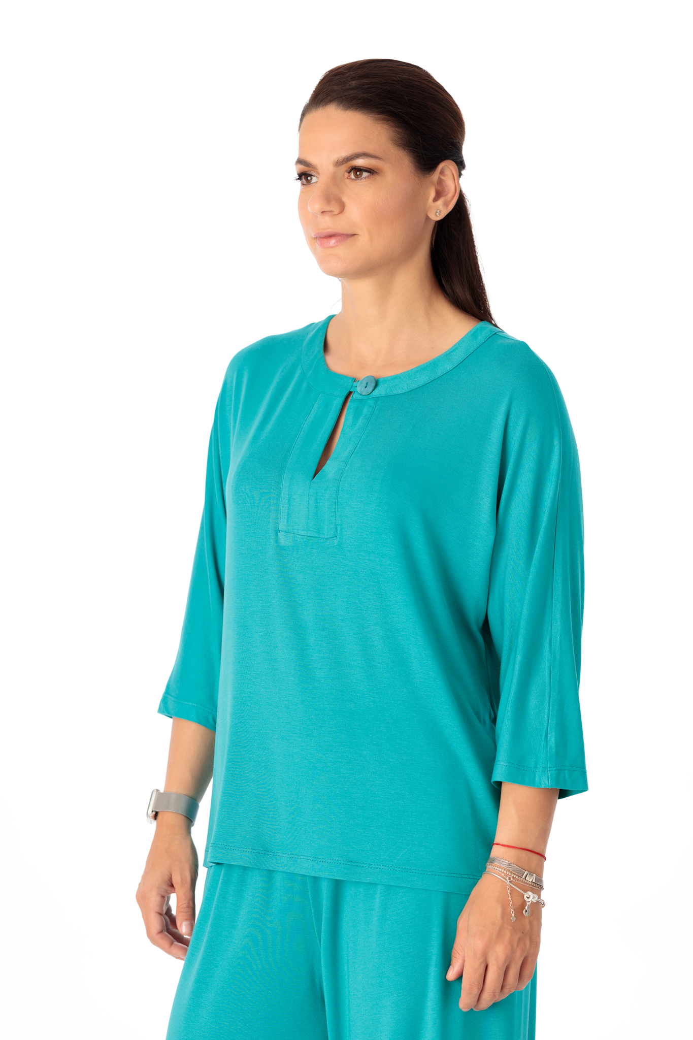 Bluza casual, croi lejer, creata din vascoza moale, elastica. Bluza are maneca 3/4 si decolteu rotund, despicat si inchis cu nasture.