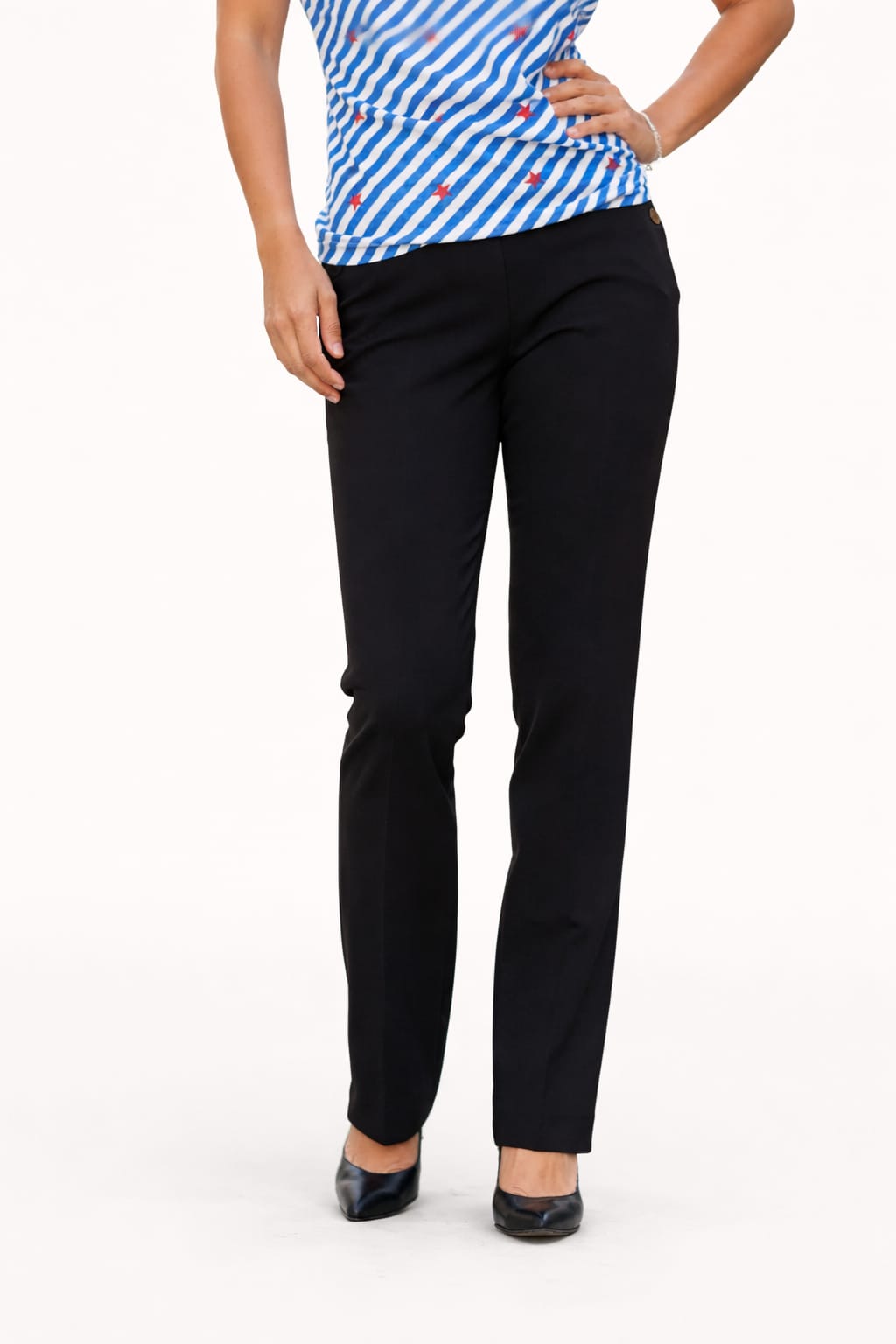Pantalon office din tesatura elastica, neagra. Are croiala dreapta, iar lungimea depaseste nivelul gleznei. Buzunarele sunt prevazute cu 3 nasturi negri. Pantalonul se inchide cu fermoar ascuns, pe lateral. Fiind elastic, avantajeaza toate siluetele. Alege sa il porti cu o camasa office si un sacou uni.