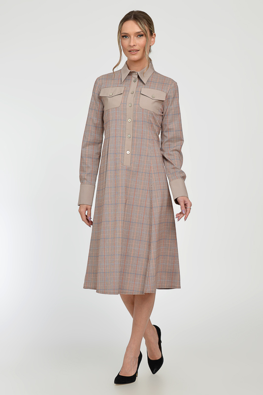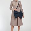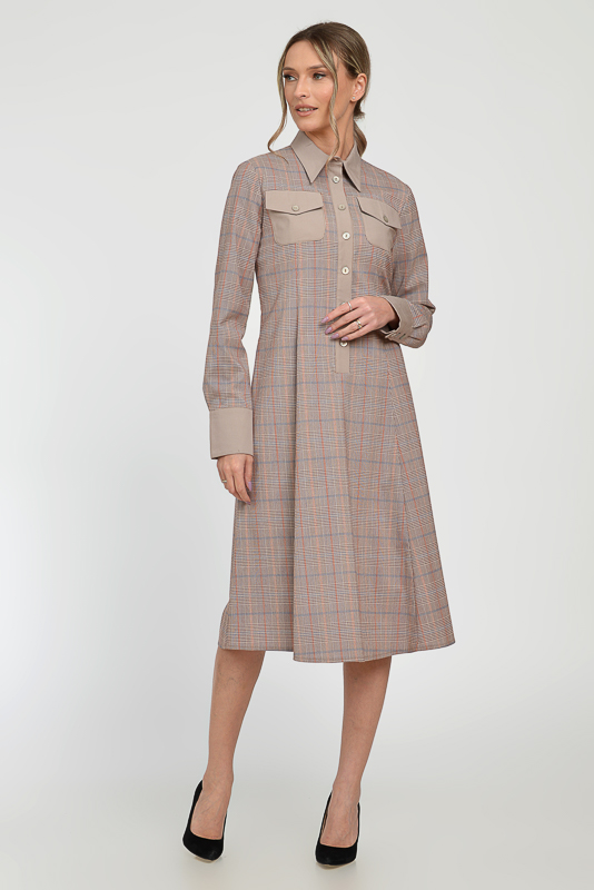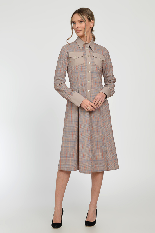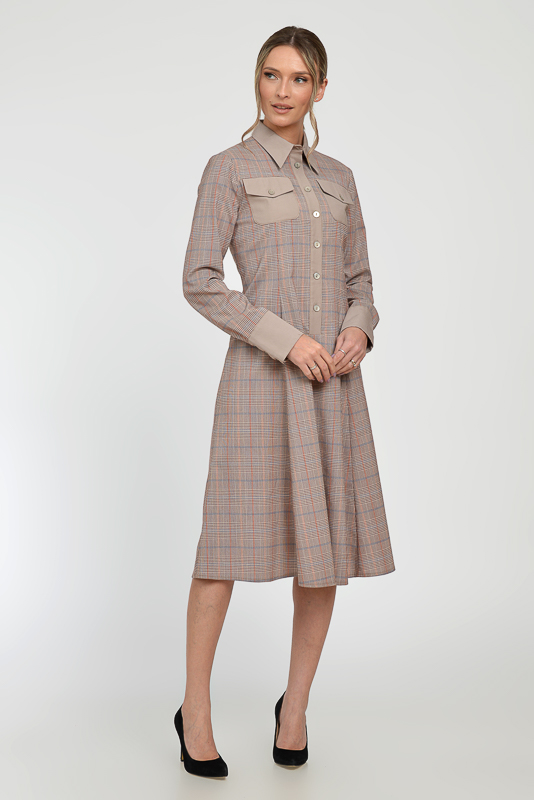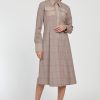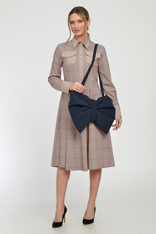 La birou, o poti purta cu pantofi in nuantele imprimeului (crem/albastru/maro/nude/oranj) si un trench chic.