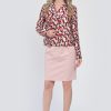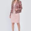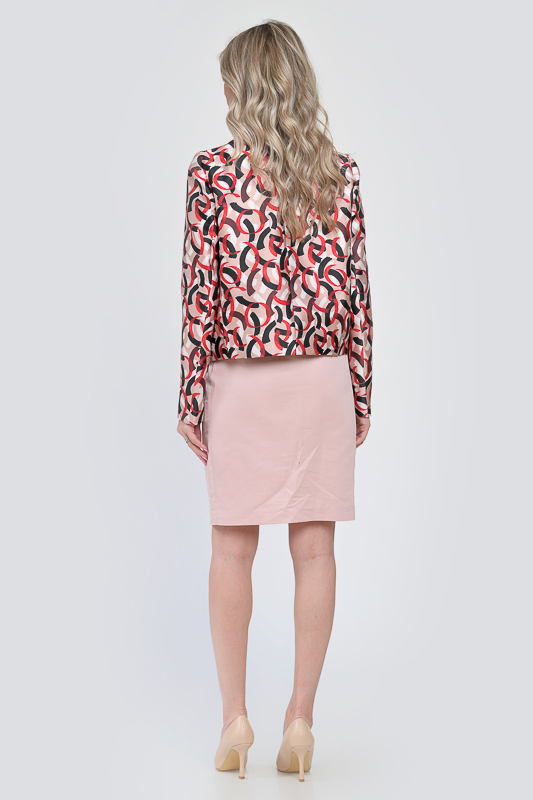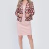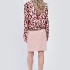 - Model cu imprimeu in nuante de rosu si crem