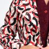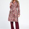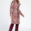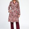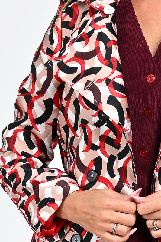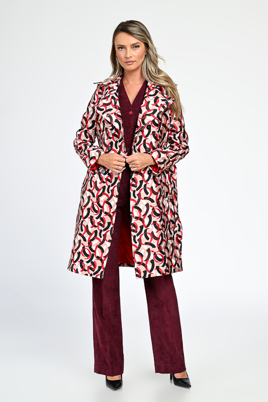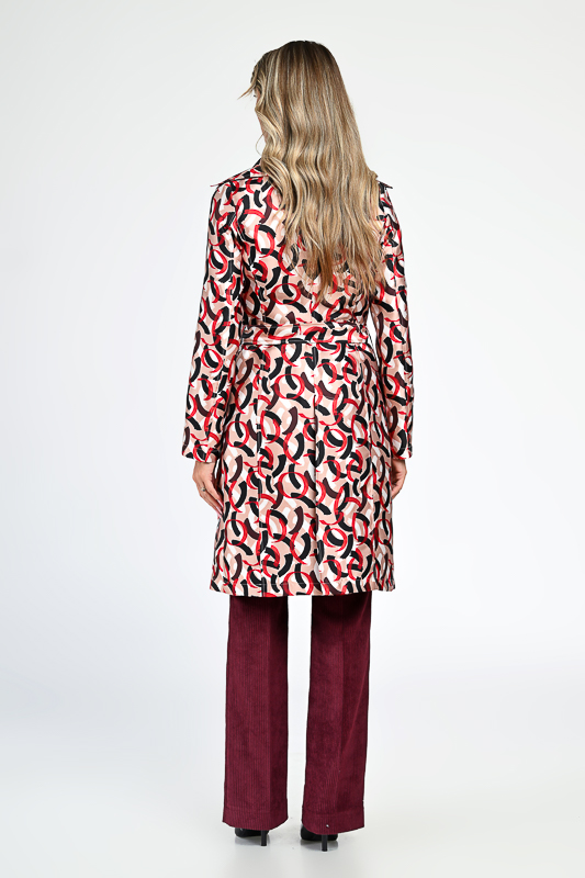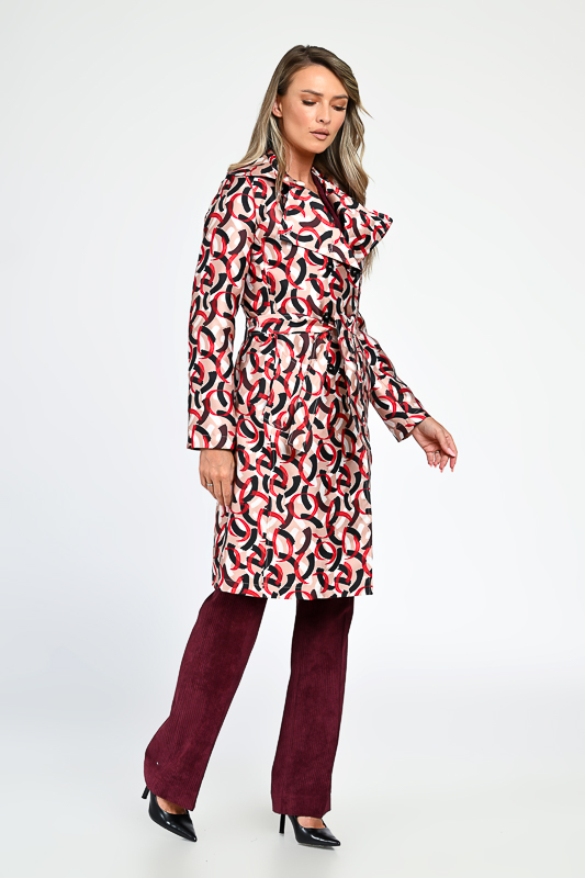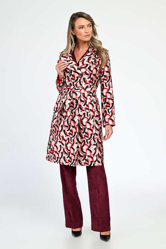 Trench dama cu imprimeu colorat, croi drept si revere ascutite. Modelul este prevazut cu un cordon in talie, din aceeasi tesatura. Trenchul se inchide cu nasturi, pe fata si are slit la spate.