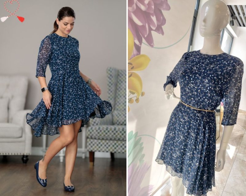 Feminina, chic, plina de expresie este noua rochie de la marca romaneasca Giorgal. Creata din bumbac fin la atingere, rochia are o serie generoasa de marimi – de la 34(XS) la 46(2XL). Partea superioara urmareste linia siluetei, se cambreaza pe talie, iar zona fustei este circulara, lejera, tip printesa. Rochia poate fi purtata atat cu balerini, cat si cu sandale cu design minimalist. Tonurile de albastru sunt placute si imprimeul atrage toate privirile!